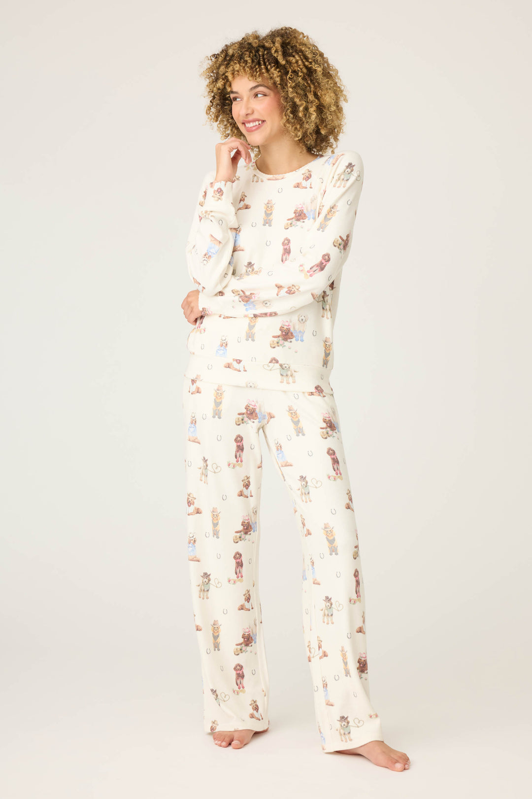 Round up some cozy charm. This ivory pajama set—crafted from soft jersey—pairs a scalloped long sleeve top with relaxed drawstring pants, both in an allover western dog print with cowboy hats, boots, guitars, horseshoes, and playful pups ready for the rodeo. A perfect match for lazy mornings or curling up after sundown.